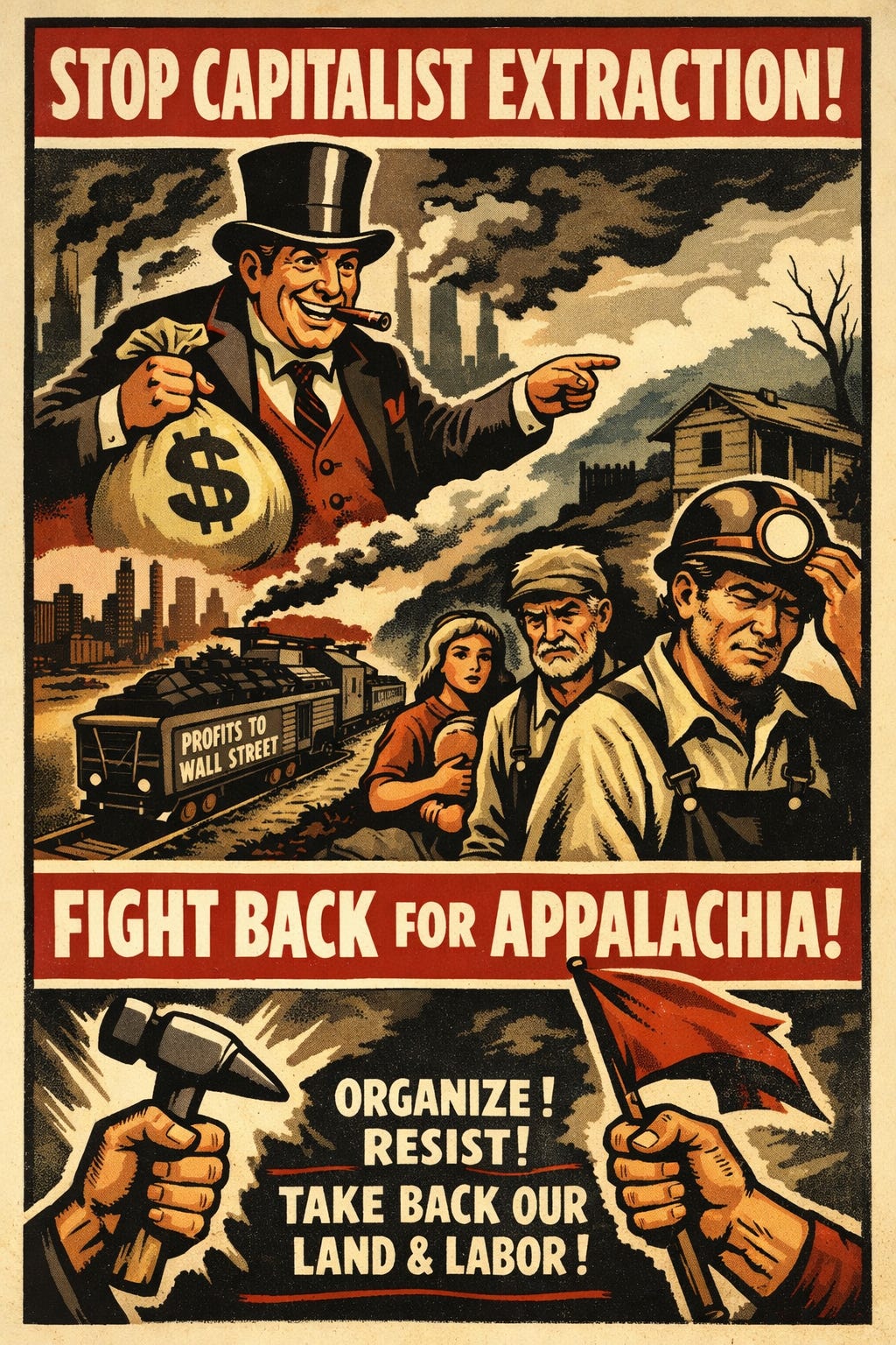 Appalachia’s long history of labor struggle, mutual aid, and resistance positions it as a critical site for transformative change. Wealth must remain where value is produced, governed by workers and communities through collective decision-making. Extractionism is a form of structural violence that reproduces class domination, accelerates ecological devastation, and deepens inequality. Its abolition is not merely desirable—it is necessary for any society organized around human need, ecological balance, and collective freedom.